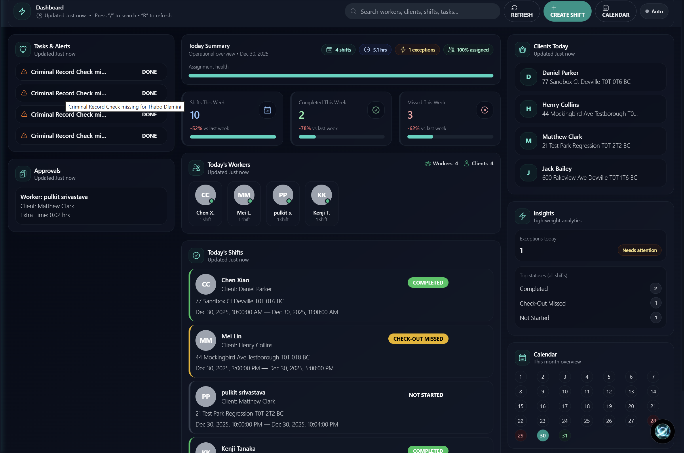 Clear status signals help you catch missed check-ins, late starts, and completed shifts in seconds.