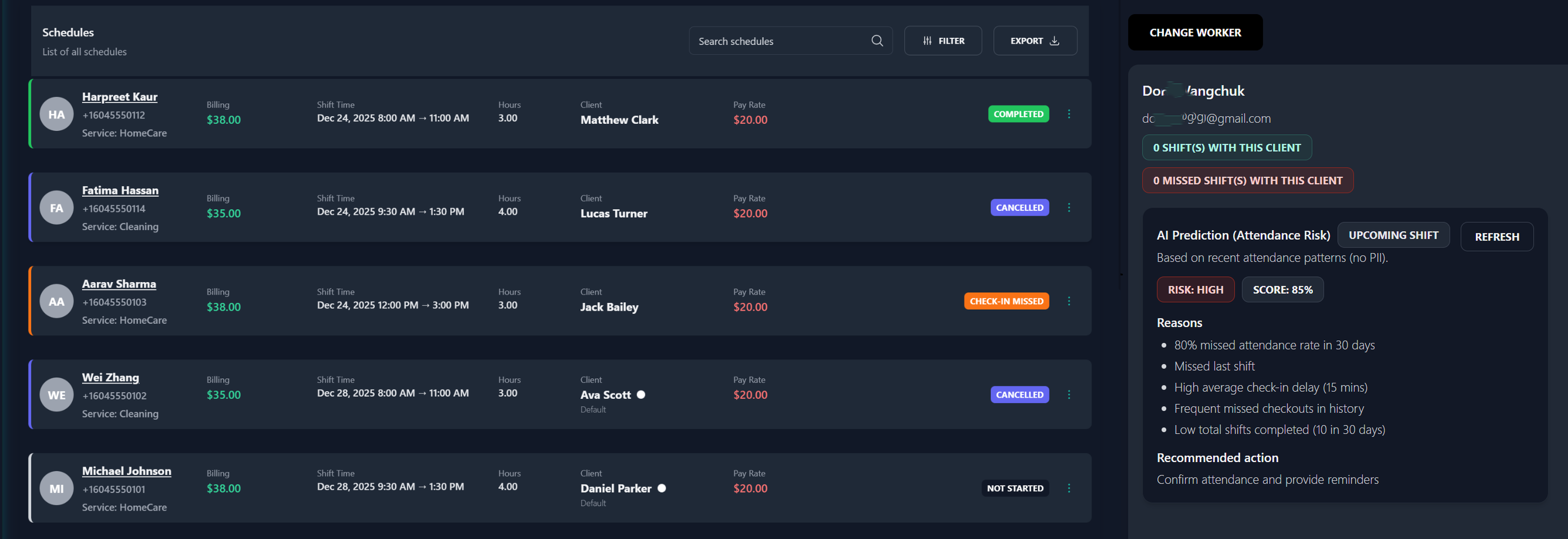 Create shifts, assign workers, and manage recurring schedules with automatic occurrences—so nothing gets missed. Edit a single occurrence or update the entire series, prevent overlaps, and keep updates synced in real time. Flags shifts likely to be missed based on history, distance, and confirmations.